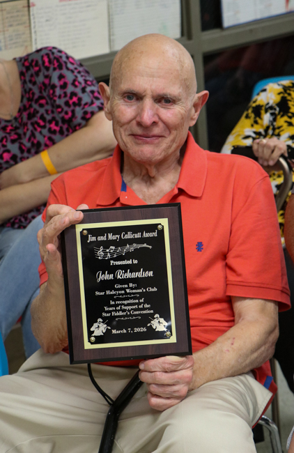 The Star Fiddlers’ Convention started 100 years ago. In 1926, the fiddlers’ convention started as the idea of Mr. CV Richardson and the PTA. The Star Halcyon took over the convention in 1954. For many years, we gave the CV Richardson Award to someone who had helped the fiddlers’ convention. Mr. Richardson has a son, John, who helped us for many years as our MC of the fiddlers’ convention. He started MCing in 1972 and took it over from his dad. Three years ago, due to their contributions, we renamed the award the Jim & Mary Callicutt Award.