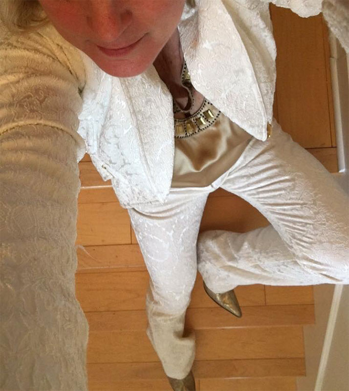 Rhonda shared this sneak peek of the outfit she’ll be wearing on her social media this afternoon, which she shot during the final fitting. It appears to be a western-themed jacket and pants in white.