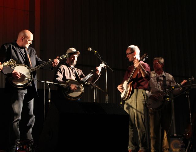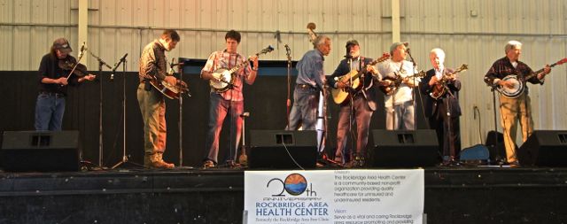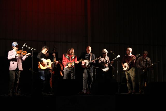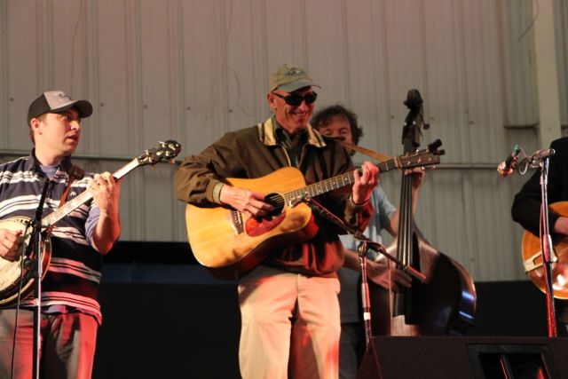 Then came the long set with Wyatt Rice, Mark Schatz, Nate Leath, and rotating kick-butt banjo guys. There was Tommy Morse, Buddy Wolf, Will Lee, Sammy Shelor, and Rex McGee each one at a time, and then all together up there. This was the CD Release Band for Rooster’s new album called Rooster’s Ruckus, and they played tunes off the CD like Lady of Spain, Ground Speed, Bye Bye Blues and some classic tunes Rooster was known for like Bugle Call Rag.
