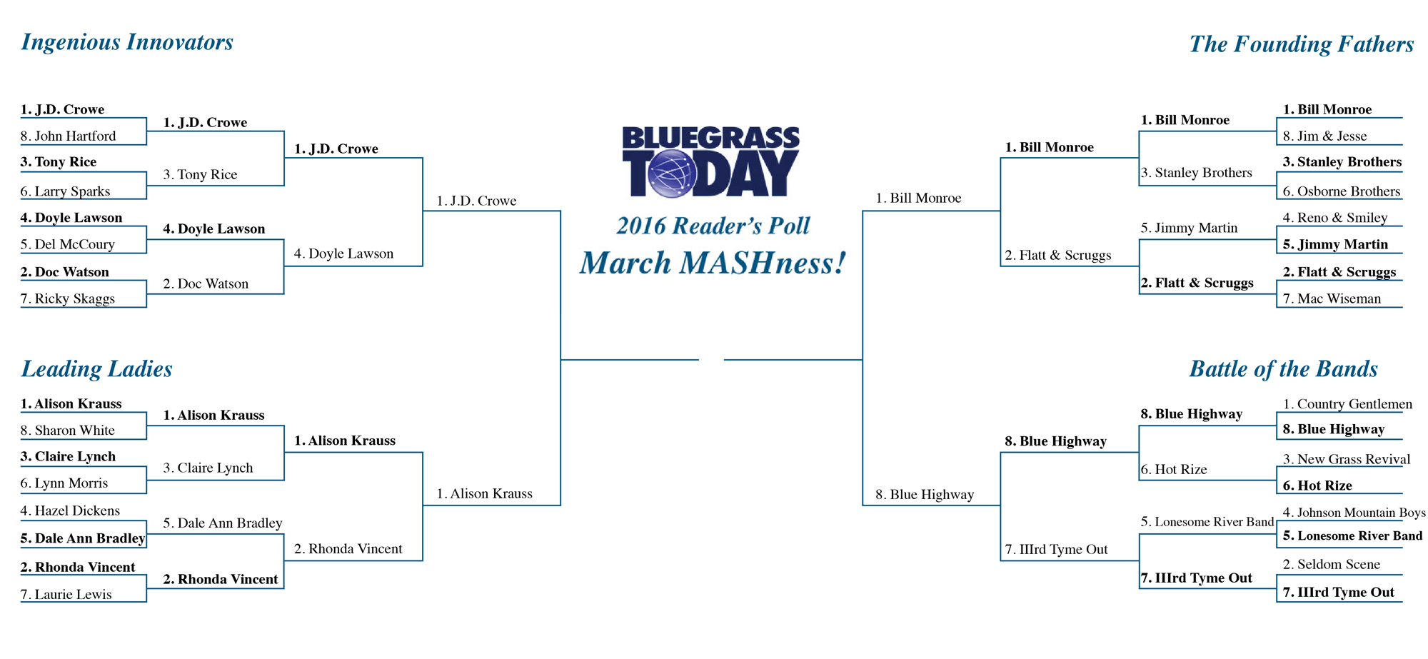 Round four of March MASHness 2016Everyone seems to be having fun with our March MASHness 2016 reader poll, where we are asking you to choose your favorite bluegrass artist through a tiered bracket that largely mirrors the NCAA basketball tournament, also coming to its conclusion next week.