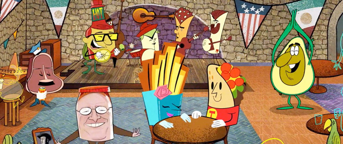 It’s an animated feature, created by LA-based Fantoons, that follows the story of Steve’s composition from the album, Santa Fe. In the song, it sounds like a fairly conventional tale of boy meets girl, boy chases girl, boy gets girl. But in the video, we learn that the romance is actually between a taco and and order of fries!