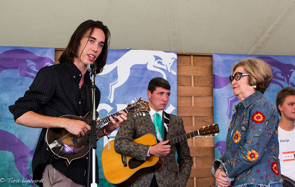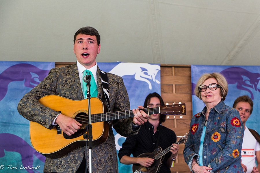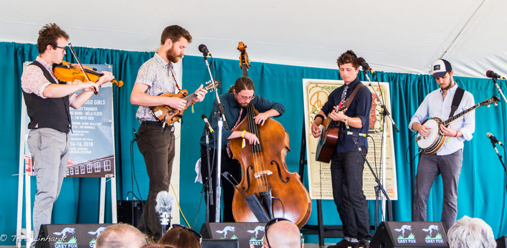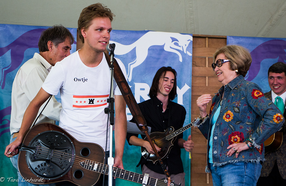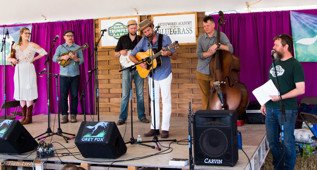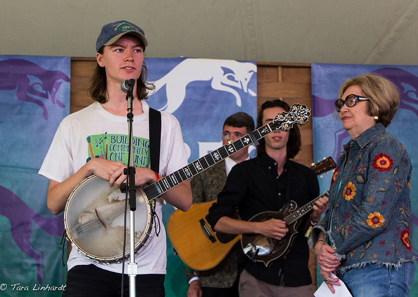 Ron Thomason and Mary Doub of Grey Fox presented the award and welcomed the Bill Vernon Scholarship Recipients 2018: Patrick Feinberg-guitar, Victor Furtado- banjo, Owen Schinkel-dobro, Eli Wildman-mandolin. Here is a tune with all of them playing together after they met at the festival this year.