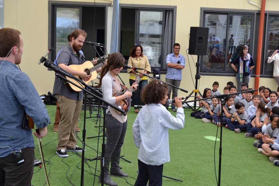 We’ve been able to collaborate with a couple students so far. Pictured is a little girl that told us she had “an awesome voice!”, so of course, I had to bring her up for a song! She wanted to do none other than Hey Brother (which all of the students knew!). Such a cool thing to have these Palestinian students know all the words to a song that Dan Tyminski sings! It was a great opportunity to explain to them that Dan is a bluegrass artist! I think they were able to connect with that – another reason bluegrass collaborations outside of the genre are so important and beneficial to the greater good of the music.