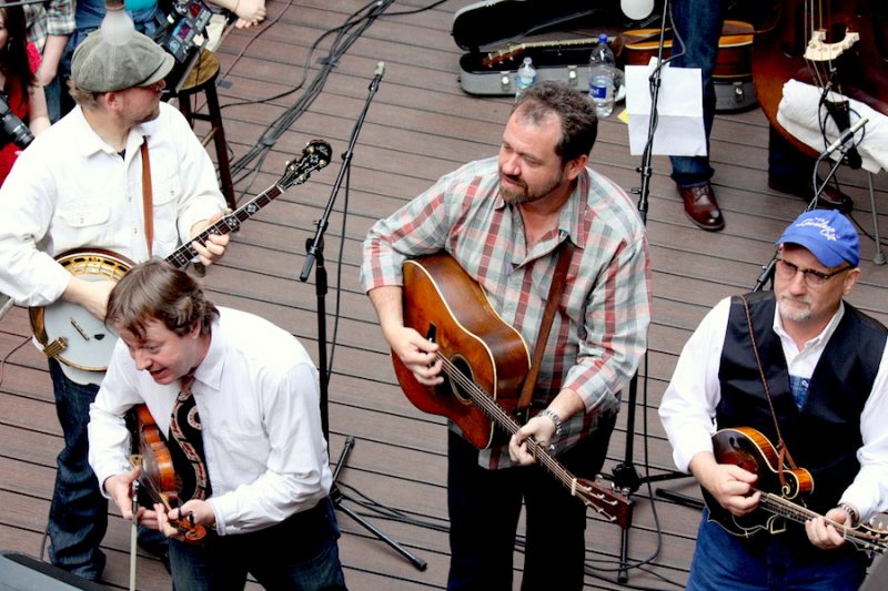 For fans of the movie O Brother, Where Art Thou? – or simply fans of great traditional bluegrass music – Gatlinburg’s Ole Smoky Holler, home of the Ole Smoky Tennessee Moonshine Distillery, was the place to be this past Saturday evening. Those people who thought George Clooney sure had a great singing voice might have been disappointed, but the crowd of several hundred bluegrass fans and lucky passers-by could hardly contain their excitement when the Soggy Bottom Boys took the stage for their first live set ever.