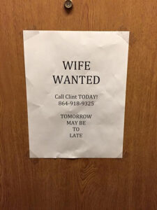 • Wife Wanted – When you wander through the hotel floors at the Music City Sheraton during SPBGMA, it’s quite common to find festival flyers posted on room doors, and a few instrument or bus for sale notices. One lodger came up with an interesting proposal taped to his door.