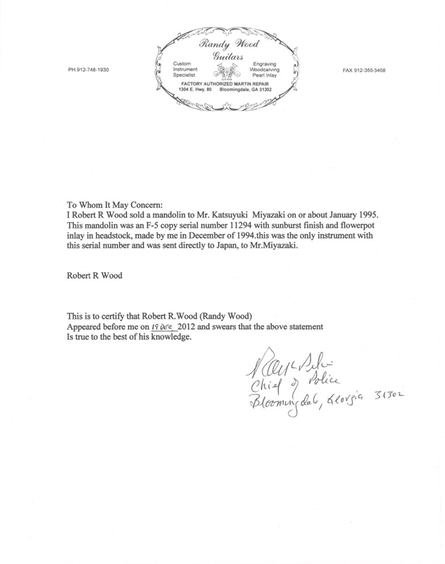 Below is an affidavit from Randy Wood indicating that the mandolin with that number was sold, through Tony Williamson, to a customer in Japan, who still has the instrument in his possession.