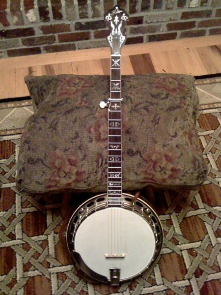 Huber VRB-3 – flying eagle inlay, antiqued binding, aged metal parts. Banjo has several deep scratches on the back, and was in a white Calton case covered with stickers. The truss rod cover is made of mahogany, and there was an Elliot push-button capo on the banjo. The serial number (inside the resonator) is 709-40.