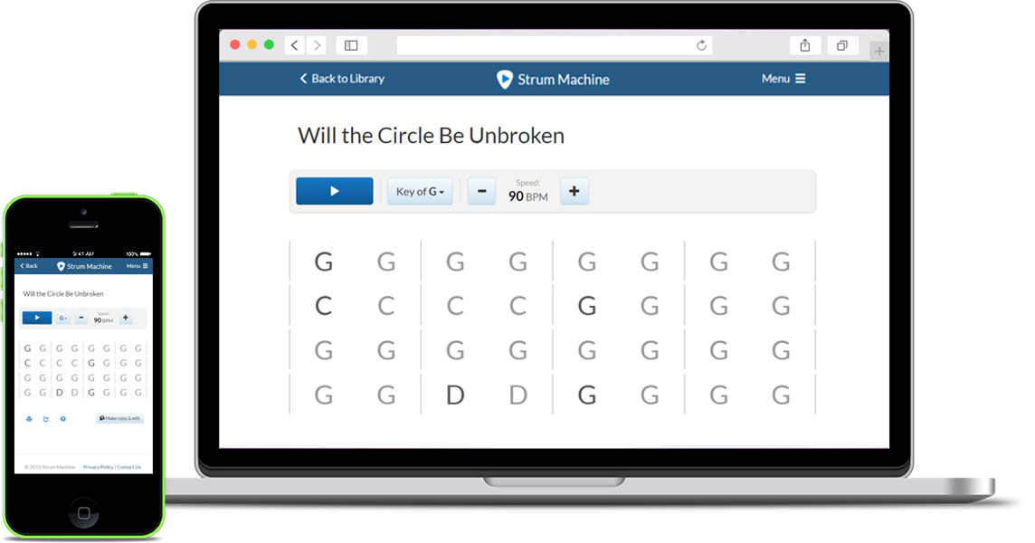 Strum Machine will work on most Mac or PC browsers (Firefox, Chrome, Safari) and on most smartphones. It does not work well with Internet Explorer or on older Android phones. The user can switch from keyboard to touchscreen controls for use on tablets or phones.