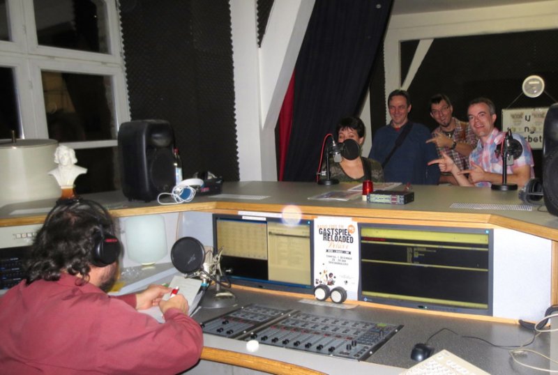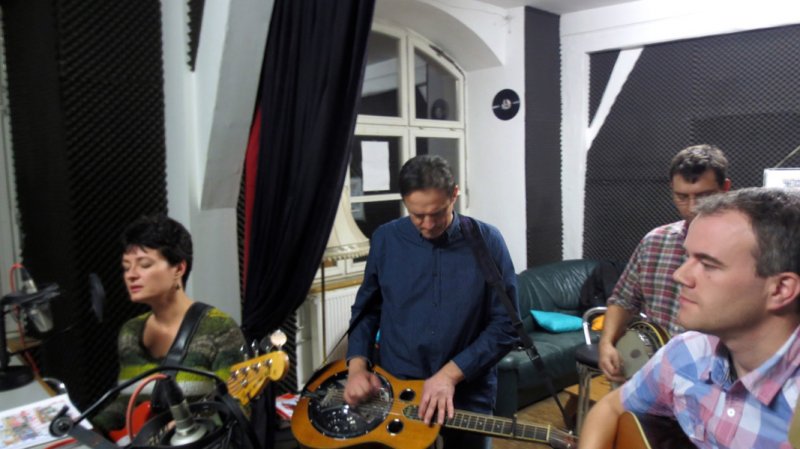 Around 6pm we met with our long-time friend Eberhard Finke, the editor of Bluegrass Buhne magazine. Eberhard took us to a nice dinner at a local restaurant downtown. He brought a few old pictures from various festivals we played with Fragment in Germany, Slovakia and Czech Republic almost twenty years ago. Time goes by fast with a good meal, tasty beer and a lots of memories. Our host Friedrich Hog (vice president of Country & Western Friends Kotz Association 1982 e.V., chairman of the German Bluegrass Association) was awaiting us at 8pm in the Radio Free FM studio, located in a historical building near the restaurant. Over an hour of talking and playing flew by quickly, and before we realized, it was time to close up the show. We were not ready to say good-bye, so we ended up in a bar nearby, where we enjoyed some extra smooth dark beer with both our hosts Eberhard and Friedrich.