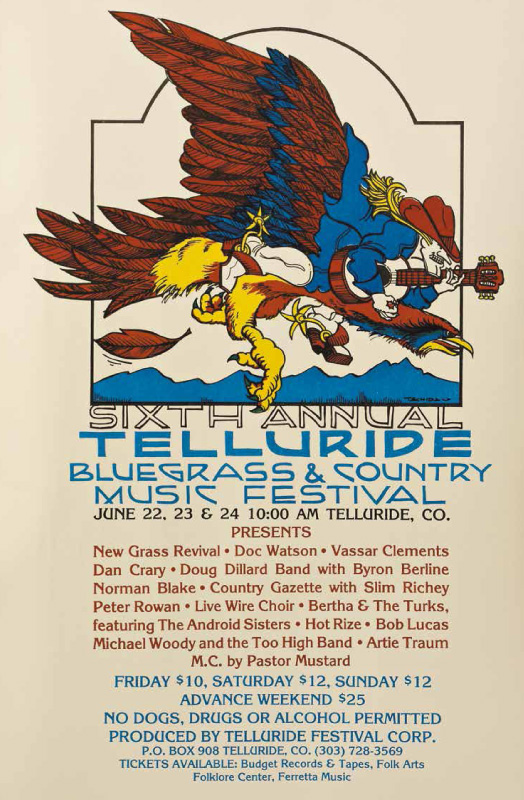 Telluride 6The Nitty Gritty Dirt Band appeared in ’86 with its colorful Nudie Cohen suits and big white hats. I’m astonished at how many musicians came to the Bluegrass music through a 1972 double album, Will The Circle Be Unbroken, by the Nitty Gritty Dirt Band. Nick Forster of Hot Rize admitted as much, for instance. In the early eighties NGDB set up headquarters in Aspen so it was altogether fitting and proper they should mosey down to Telluride. NGDB was also one of those groups that started as a jug band, except with guys like Jackson Browne and Bernie Leadon of the Eagles. The watch works of the Dirt Band’s universe meshed tangentially with acts in the TBF mechanism. They were a bigger-venue act, until one June night in 1986. Of their many incarnations, their lineup that night with Jimmy Ibbotson remains my favorite.