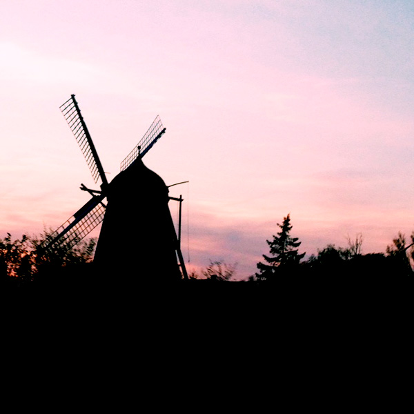 Driving through the southernmost part of Denmark, up towards Copenhagen, I was hit by the peacefulness of the surroundings, and the relative starkness of the countryside. Green fields dotted with the occasional farm or square house with pointed roof. The sun was setting, and I’d sometimes catch a glimpse of a silhouette of an old style windmill against the dark pink and deepening dark blue backdrop; the nearly ubiquitous band of glowing golden yellow following us around at ground level.