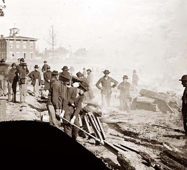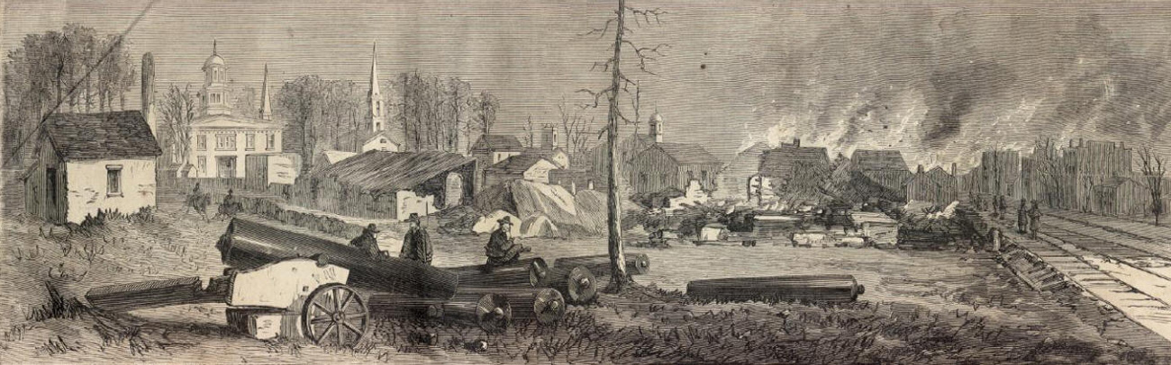 On November 15, 1864, General Sherman gave orders to burn all public buildings, machine shops, depots, and arsenals in Atlanta. While setting out for Savannah that same day Sherman stated, “Behind us lay Atlanta, smouldering and in ruins, the black smoke rising high in the air and hanging like a pall over the ruined city.”