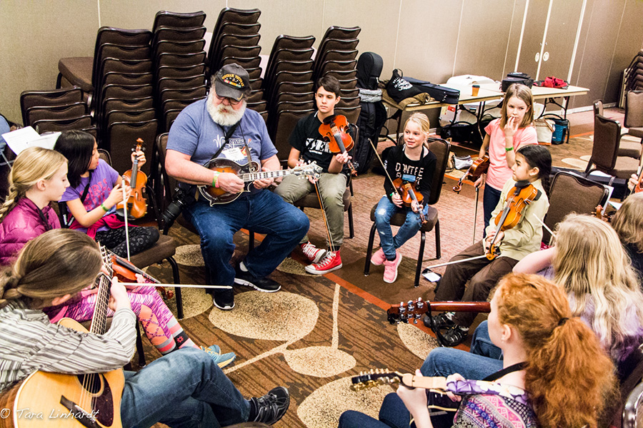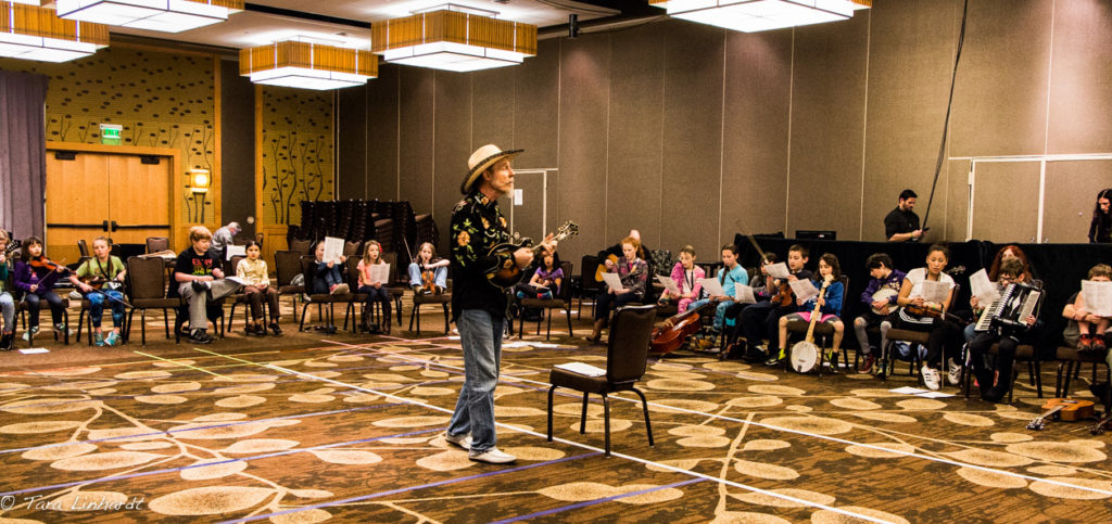 The Wintergrass Youth Academy runs Thursday and Friday of the festival, and has a wide array in ages of participants. They work with an adult band leader in a small band context, as well as on some songs with the whole group. The kids will work up to performing on Friday on a main festival stage, and get to try some other instruments, folk dancing, and other fun activities. Joe Craven does a great job as a leader of the large group time with the Youth Academy, and has the kids laughing and smiling and getting really excited about all the ways one can have fun with music. It is hard to not get excited about music with Joe Craven demonstrating how pumped he is about playing.