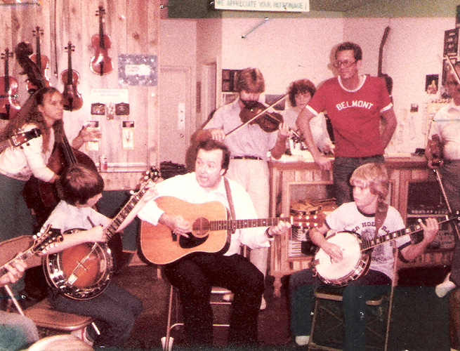 Tom Henderson leads an early iteration of the Bluegrass Parlor BandPerhaps Henderson’s most enduring legacy is his support for young grassers in the area through the formation of The Bluegrass Parlor Band. The idea occurred to him shortly after the opening of store, to grab up some of the teenaged pickers who were hanging out there, and getting them out in front of music fans in the area. Tom mentored the young players, showed them how to work together as a band, and found them opportunities to perform before live audiences.