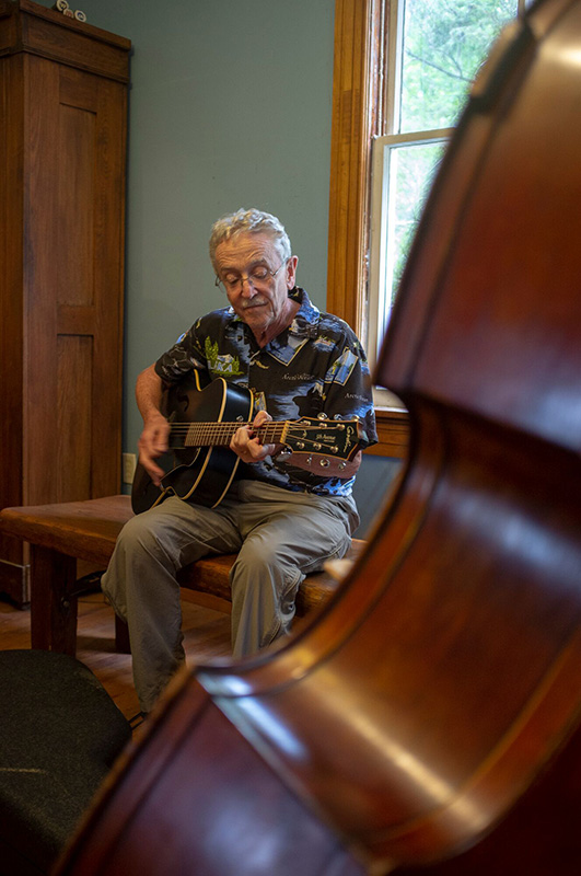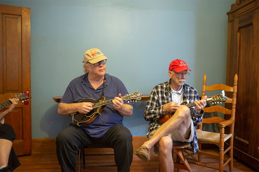 Tom Mindte and Tom Jarboe join the jam at Tom Mindte’s Pickin’ Party (10/6/18) – photo by Jeromie Stephens