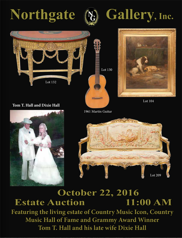 Tom T. and Dixie Hall estate saleOn Saturday, October 22, Northgate Gallery in Brentwood, TN will host a living estate sale for the collected property of Tom T. and Dixie Hall.