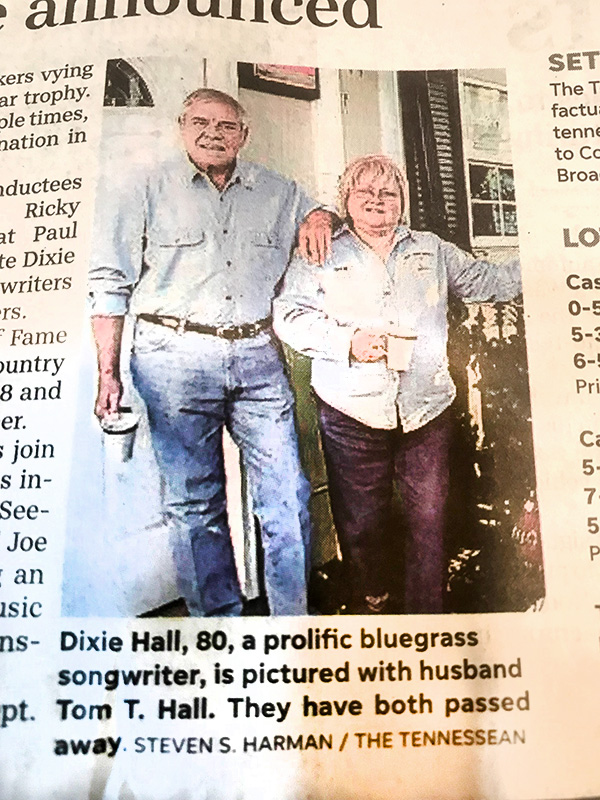 The caption in the paper read, “Dixie Hall, 80, a prolific bluegrass songwriter, is pictured with husband, Tom T Hall. They have both passed away.”