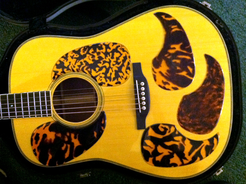 Currently the company offers five authentic-looking tortoise shell styles. They include 30’s and 40’s likenesses as well as newer-looking creations. Tortoguard is also the first company to offer a regular production guard like the one appearing on one of the most prominent guitars in bluegrass music history: the 1935 Clarence White/Tony Rice Martin D-28.