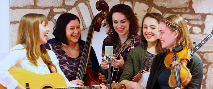 Laura is on fiddle and reso-guitar, with Charlotte on guitar. The group is completed by Leanne Thorose on mandolin, Eleanor Wilkie on bass, and Tabitha Agnew on banjo. Young Tabitha, at only 18, is the baby in the band, but has already made her presence felt in the UK acoustic world through her work with her two brothers in Ireland’s Cup O’Joe. She is an exceptionally skilled banjoist, especially given her age, and has garnered wide attention through videos with her brothers online.