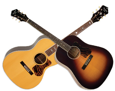 The RAJ-116 has a solid spruce top with laminate mahogany back and sides. The RAJ-126 has all solid spruce and mahogany, with a shaded, sunburst finish. Both have a pinstripe pick guard installed.