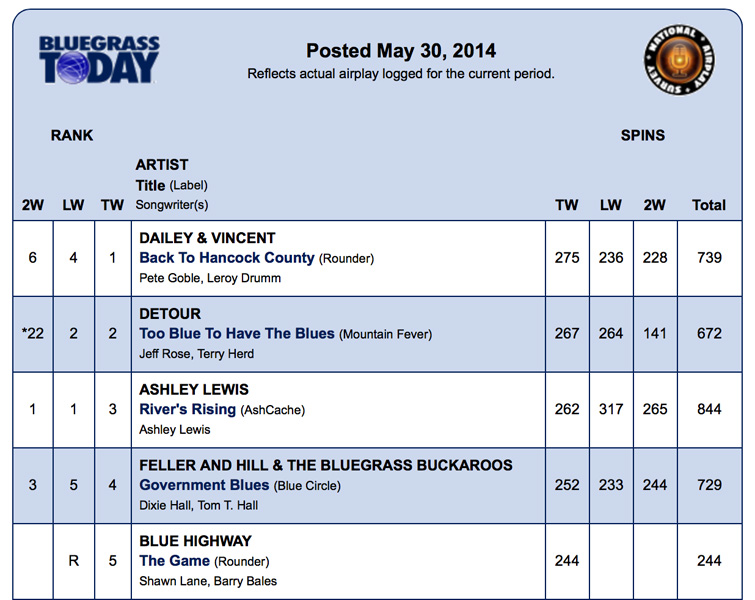 We see some changes at the top this week. Dailey & Vincent’s version of Back To Hancock County has snagged the #1 spot away from Ashley Lewis, and both Detour and Feller & Hill are moving up as well.