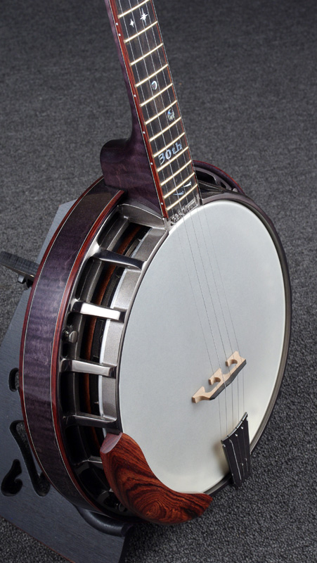 The pot assembly is the standard Nechville Heli-Mount with a special, 30th anniversary, Cyclotronics, 30-hole tone ring. All the metal parts are coated with black chrome and the tuner buttons are amber.