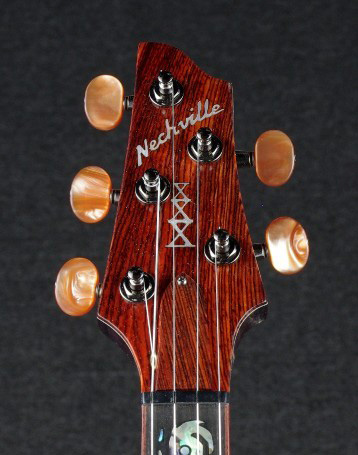 The neck shape is of Nechville’s phantom style with the fifth string running through a channel in the neck. A special XXX custom peghead overlay of cocobolo matches the binding on the neck and resonator. Inlays in the neck are similar to the Nechville Galaxy pattern, but with “E=MC2” at the 7th fret, and “30th” at the 19th.